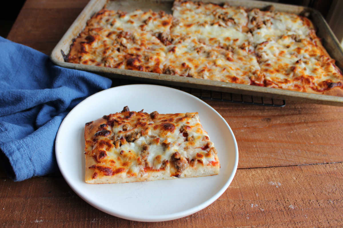 Baking it in sheet pan makes it easy to get square or rectangle pieces, just like the good old days. Plus the dough is more of a batter that is spread into the pan rather than a tighter pizza dough you might be used to.
